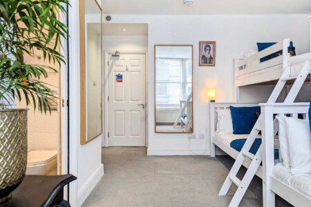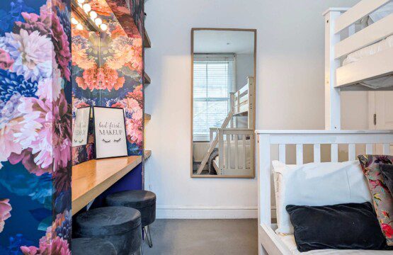 This spacious bedroom includes a a triple bunk (double bed on the bottom and a single bed on the top) and a great space to get ready for the main event!