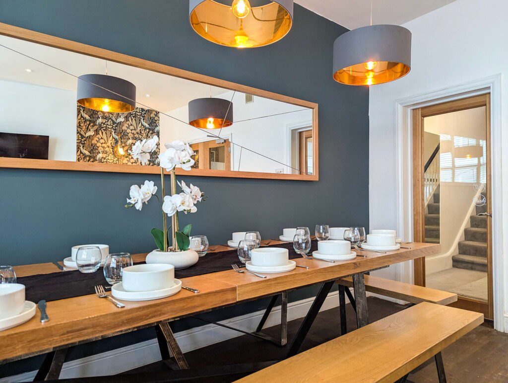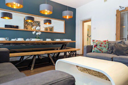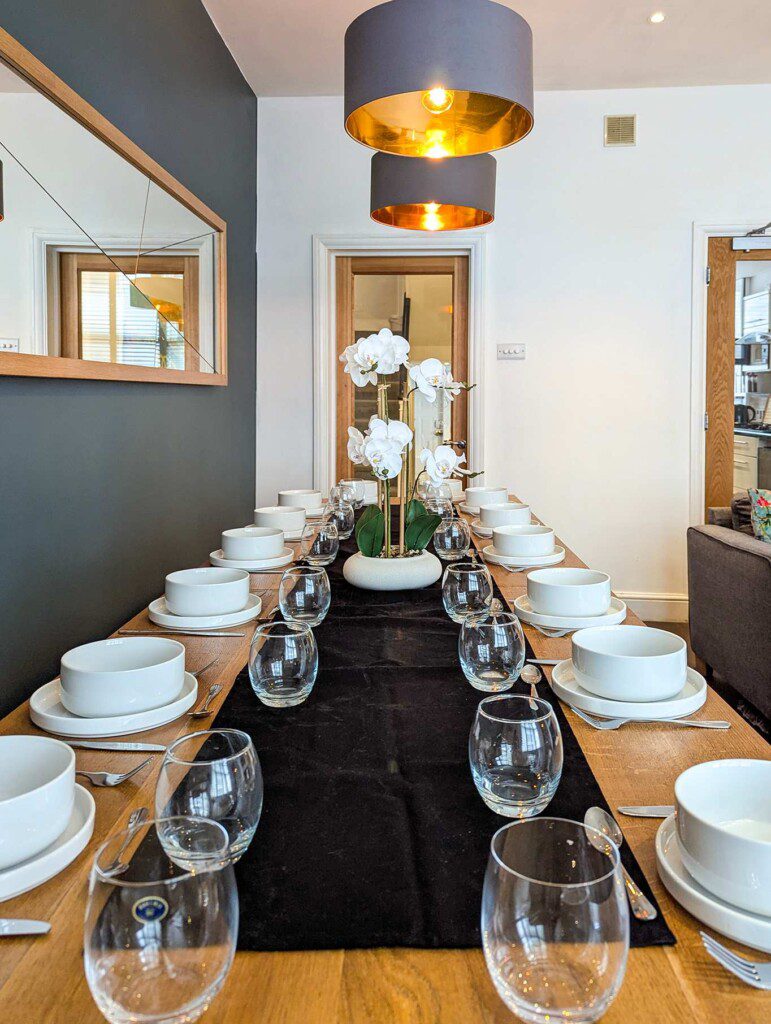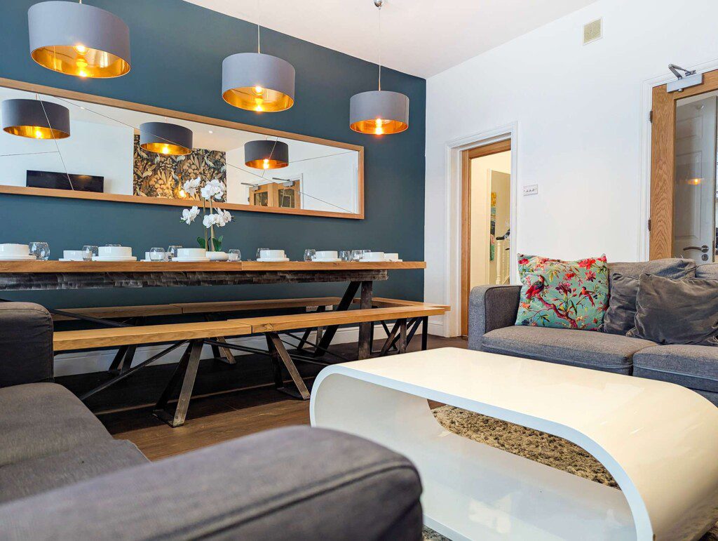 The spacious lounge offers comfortable seating, a smart TV, and an open-plan dining area. It’s ideal for relaxing or hosting meals, with a dining table that accommodates up to 16 guests.