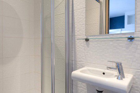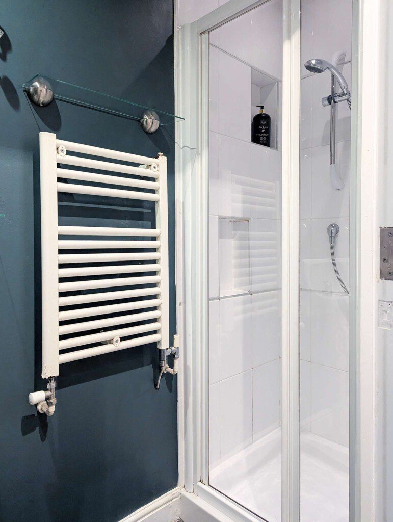 Shower cubicle, sink, WC and heated towel rail.