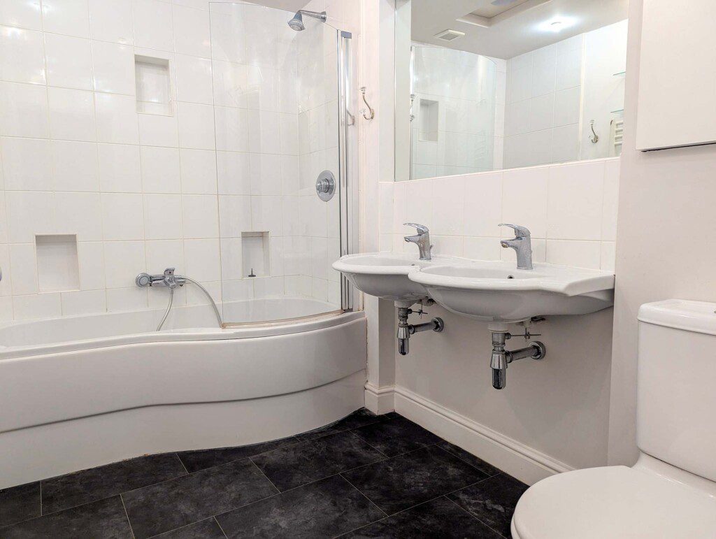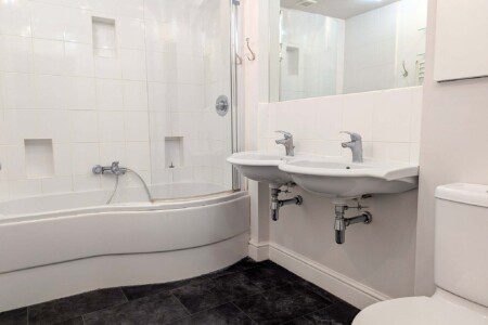 Bath with shower overhead, double sink for multi use convenience, WC and heated towel rail.