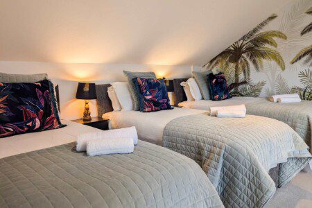 A versatile room with three single beds and one sofa bed, ideal for accommodating larger groups. Access to the roof terrace is through bedroom 3.