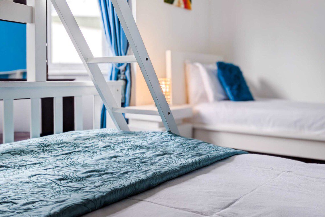 Lovely, bright bedroom with a triple bunk bed and a single bed to sleep four, equipped with a dressing table and chair and a hairdryer. Pretty accessories and matching prints complete the look.