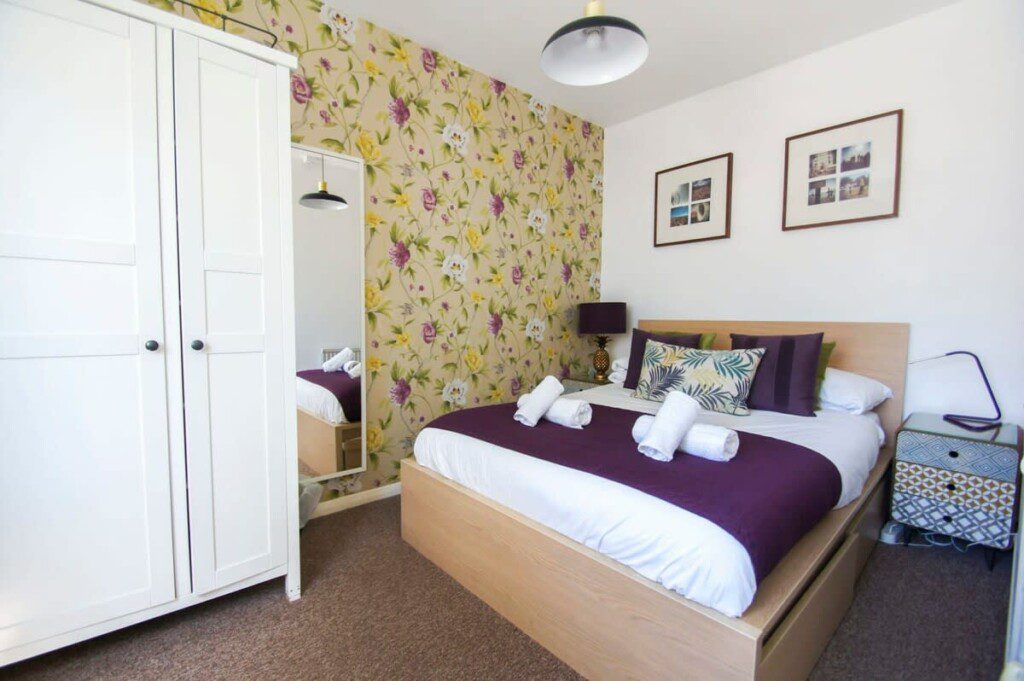 Cosy double bedroom with a double bed with side tables and lamps, a cottage style white wardrobe, and occasional chair with side table and reading light.