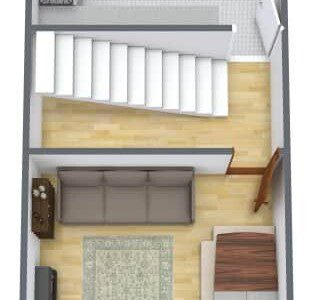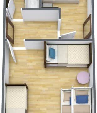 A spacious second-floor room featuring two single bunk beds and a double bed, perfect for larger groups.