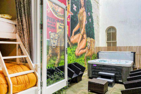 The vibrant outdoor terrace with a Bettie Page mural and a seven-seater Wellis hot tub (available for £150) adds a unique touch to your stay and offers a private oasis outdoor retreat.