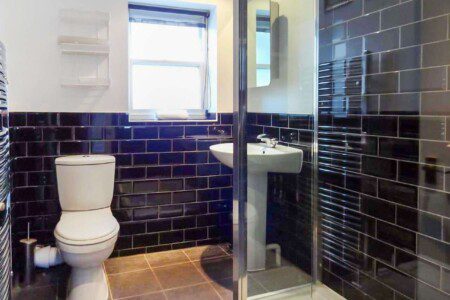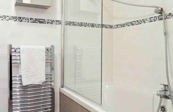 Modern bathroom, including a bath with shower overhead, WC, sink and heated towel rail.