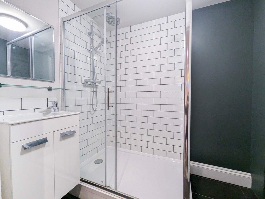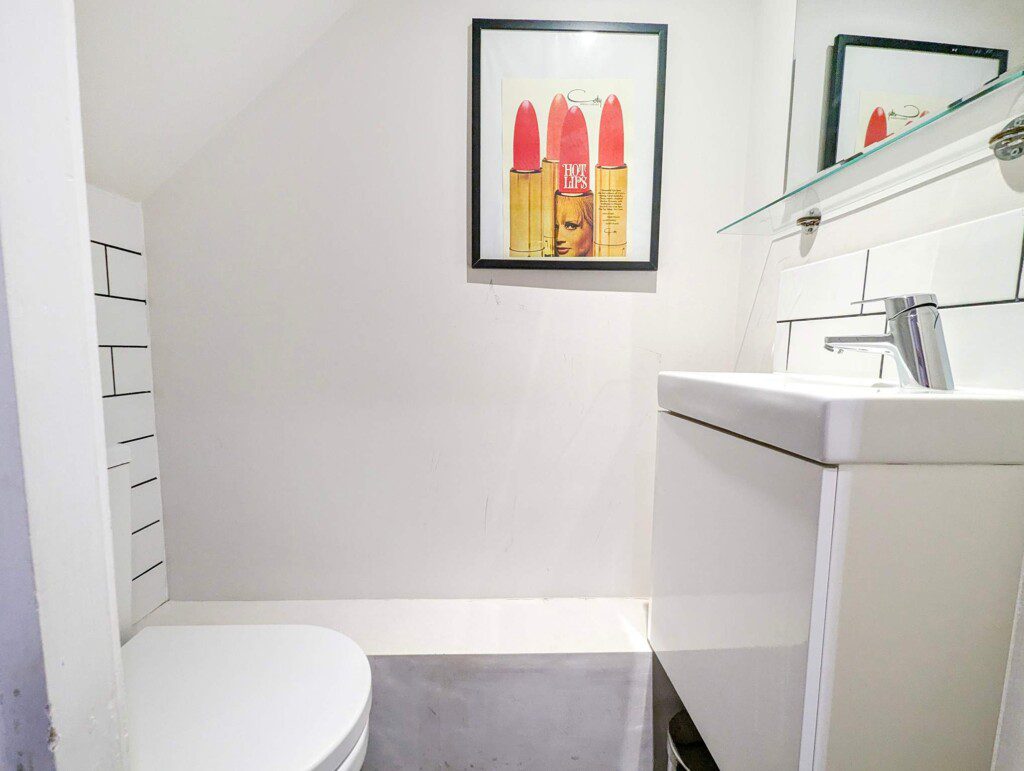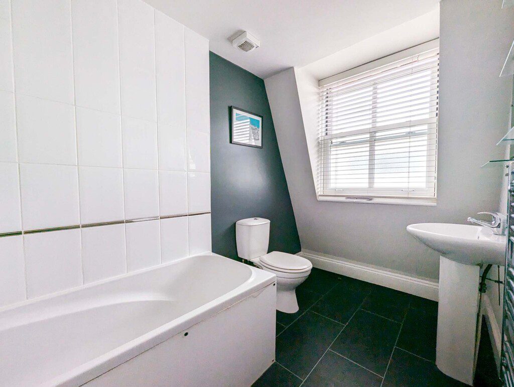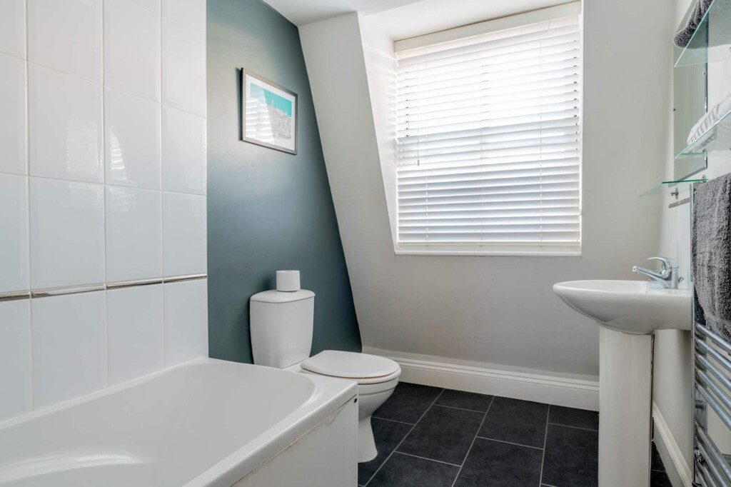 An ensuite bathroom on the ground floor with a bath, overhead shower, basin, and WC.