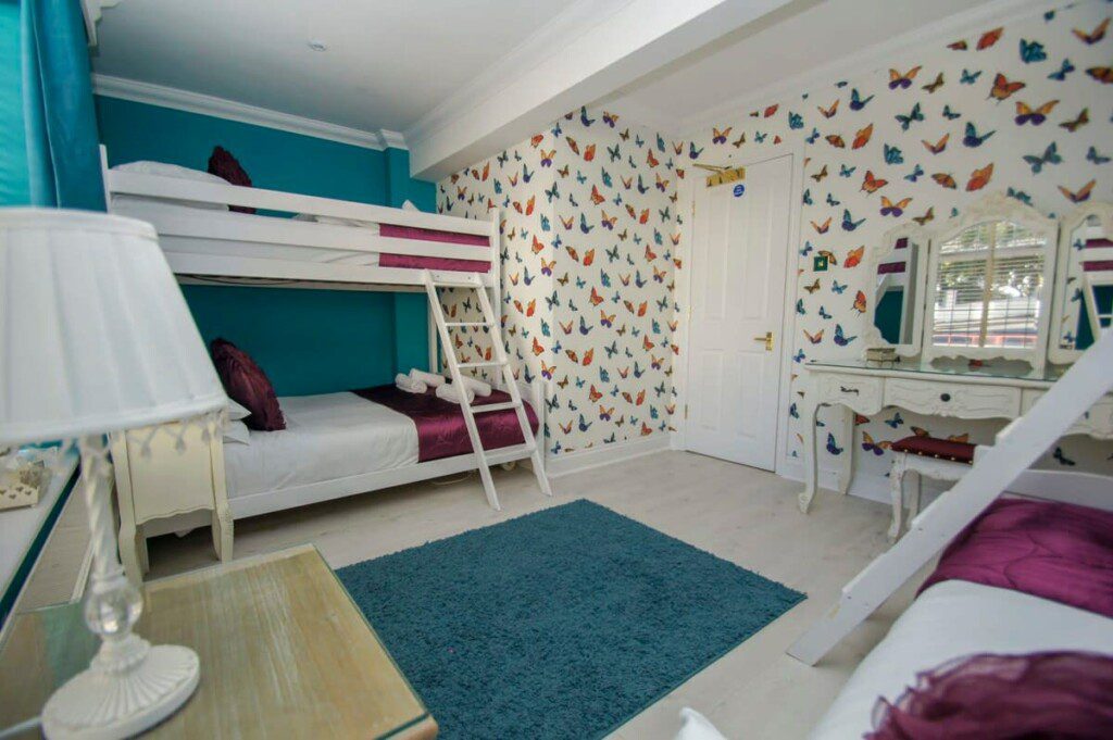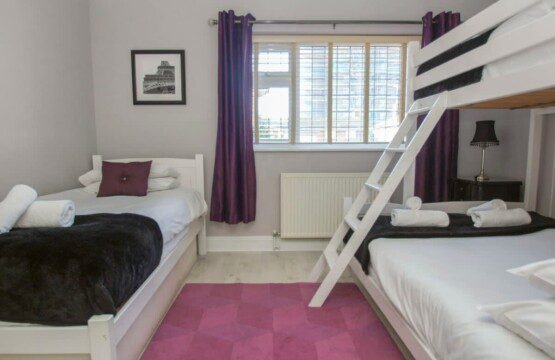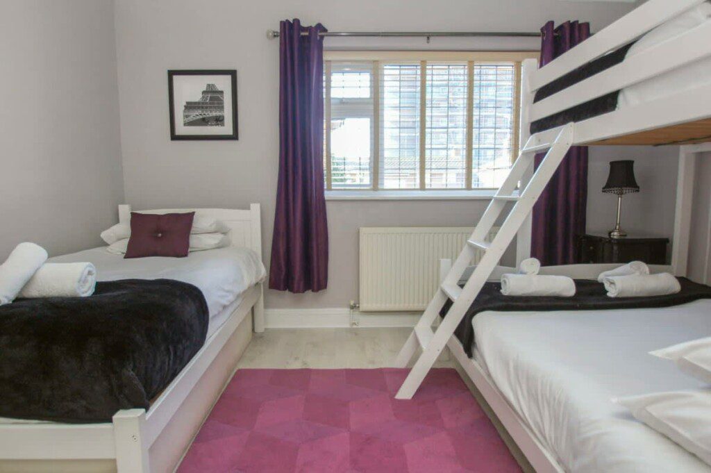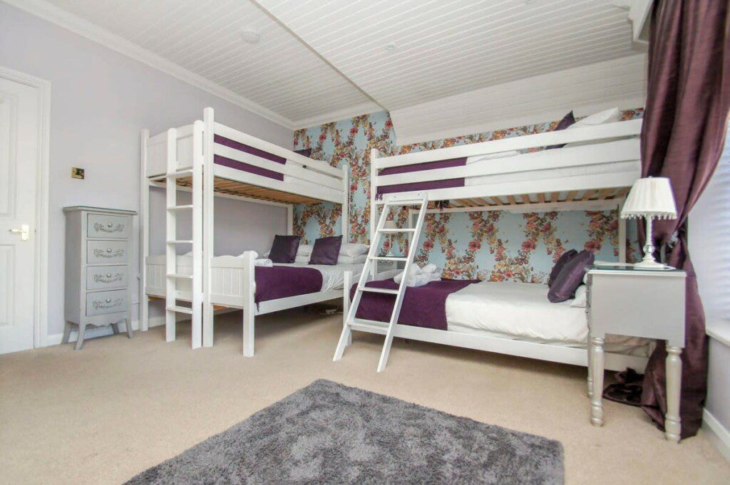 With a triple bunk bed and an additional single bed, this lovely bedroom has feature wall and black bedside tables contrasting against the wallpaper. The bedroom has access to Bathroom 1.