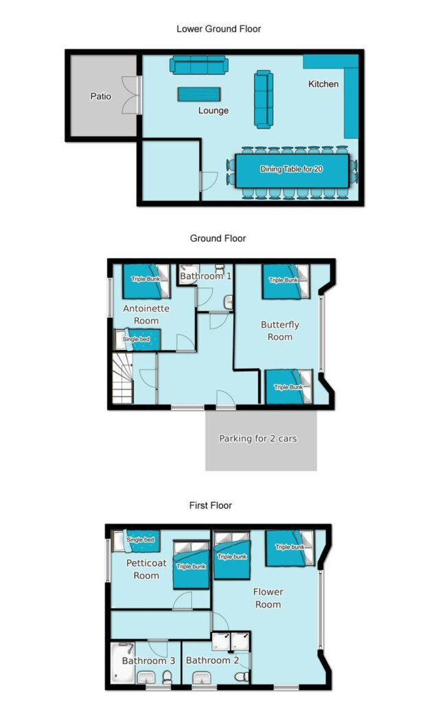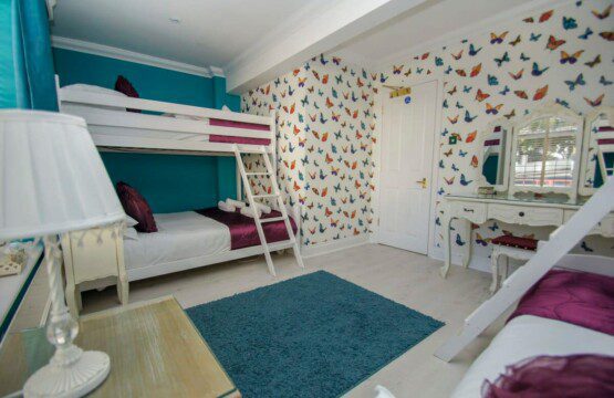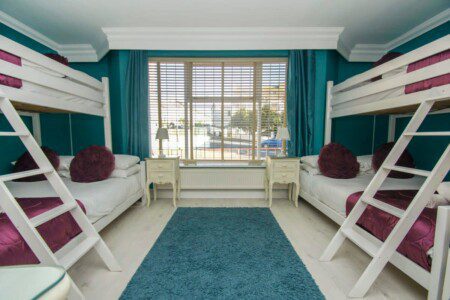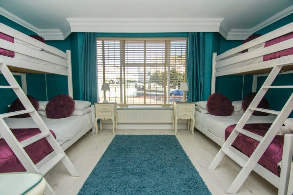 Two adult triple bunks comprising of one double bed on the bottom and a single on top. A stunning dressing table, and two bedside tables complete the look of this room. All bunk beds used in this property have been handmade to order and specifically designed for adults.