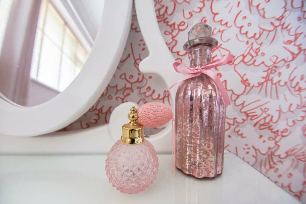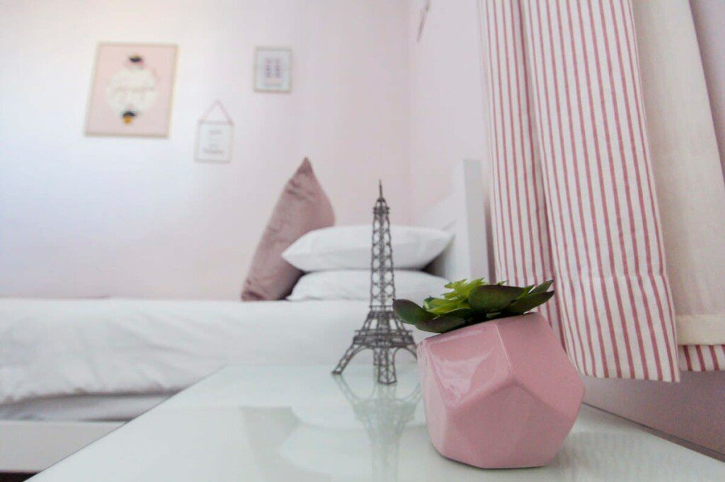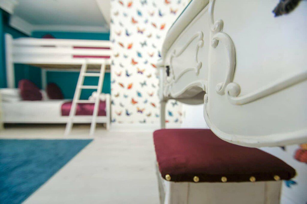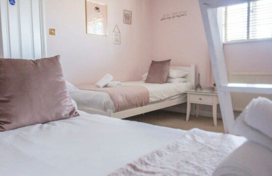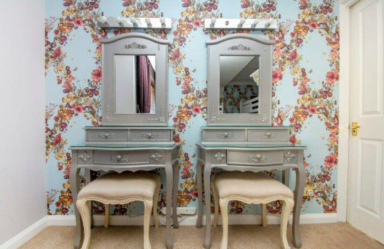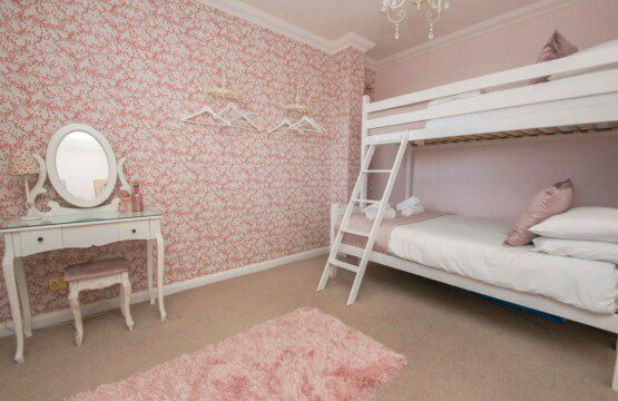 Another bedroom with a triple bunk bed and a single bed, French style dressing table with added accessories. Decorated in pink with a feature wall, silky cushions and soft throws.