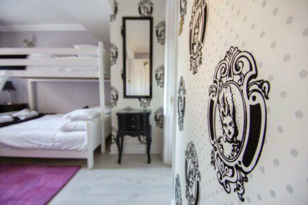 The interior has a French theme with each bedroom carrying it’s own individual style with designer wallpaper from the likes of Vivienne Westwood to beautiful Louis VX style dressing tables.