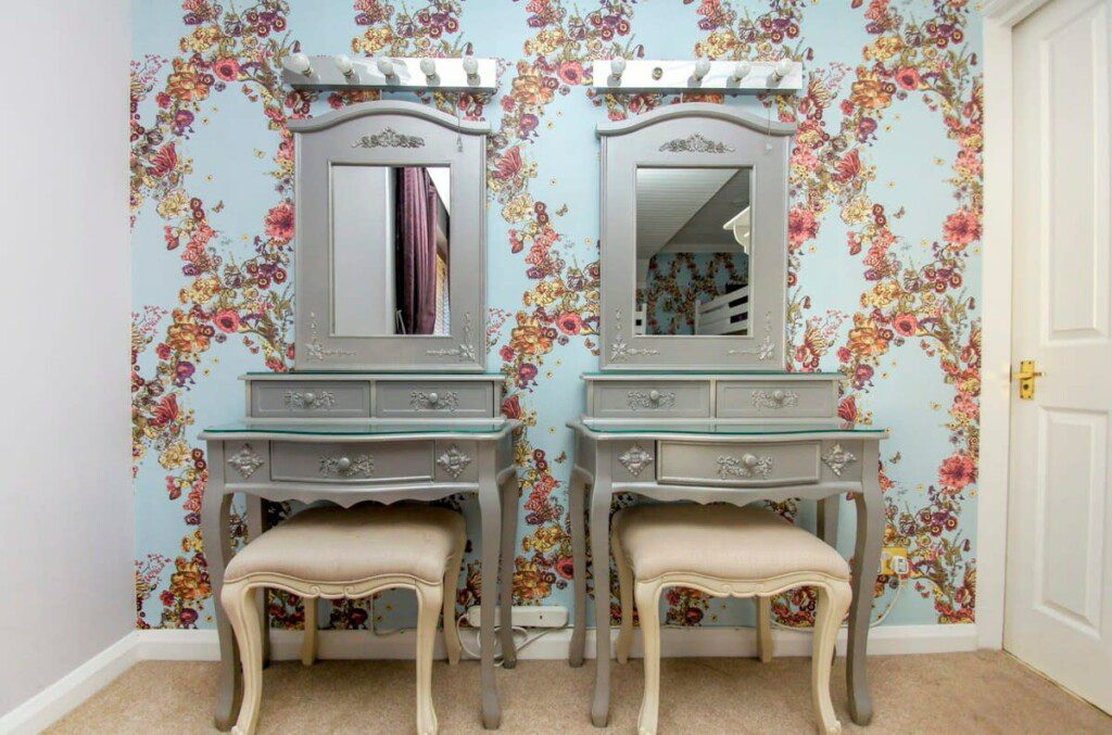 This spacious bedroom comes is decorated with beautiful flower wallpaper and comes with two triple bunk beds and two dressing tables alongside the wall- great spot to get ready.