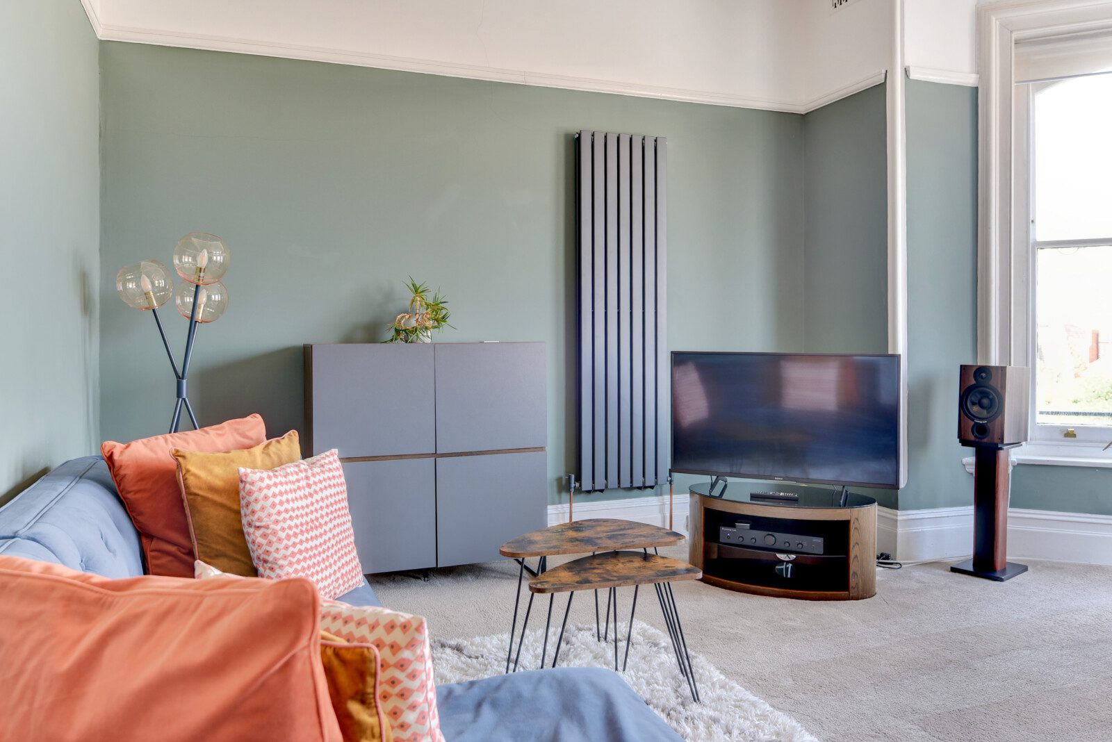 Contemporary living room with plush carpet and comfy corner sofa. Sony Bravia TV with Netflix, Prime, Spotify, YouTube, etc. High-quality Cambridge Audio amplifier and speakers- play music or films via the TV, or connect to the Bluetooth receiver to stream music direct from your phone. The dining table seating four, is positioned by the large windows which brings in lots of light all year round.