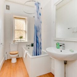 Good size bathroom with bath and wall mounted shower, sink, WC.