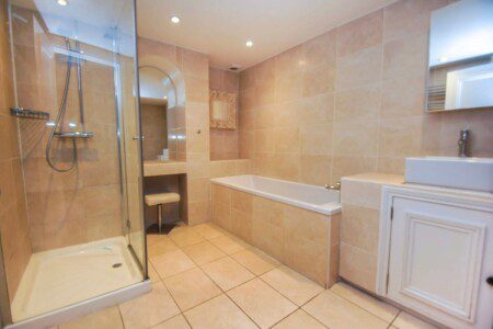 Convenient bathroom for the social ground floor and bedroom 1. There is a shower cubicle, WC, sink and heated towel rail.