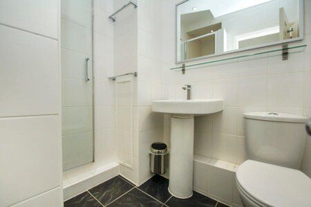 Tiled from floor to ceiling, the bathroom is clean and has a contemporary finish. There is a wash basin with a large mirror above it, shower cubicle with powerful shower, heated towel rail and WC.