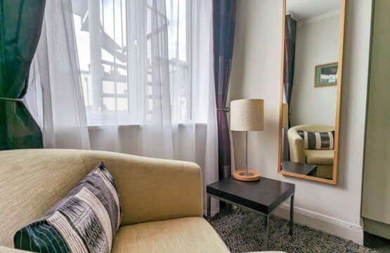 The living room is filled with light and has lovely features such as a large bay window and a period fireplace. Comfortable seating provided by a couple of two seater sofas, one of which converts into a small double sofa bed for two guests. Wall mounted TV allows you to watch the news or a movie from any corner of the room. There is also a DVD player, radio with CD player as well as free Wi-Fi.