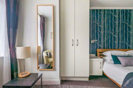 To the rear of the building, the large hotel style bedroom is spacious and houses a King size oak bed dressed with pretty cushions and a matching throw. For guests booking longer stays, there is plenty of storage including drawer and hanging space.