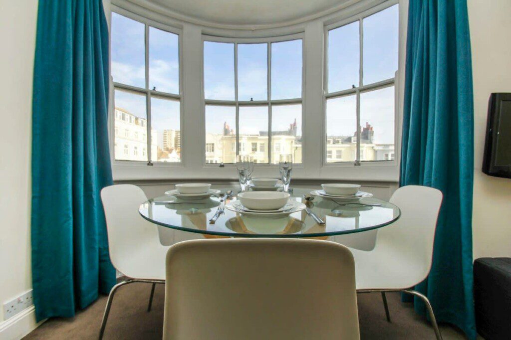 The dining table seating four, is ideally appointed by the bay window which offers a spectacular view over the New Steine gardens and out to the sea. Sit back and relax with a glass of wine while watching the white yachts tacking across the sea.