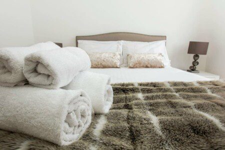 Another contemporary bedroom with double bed, white bedside tables and lamps. A gloss, white wardrobe takes care of unpacking.