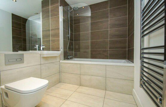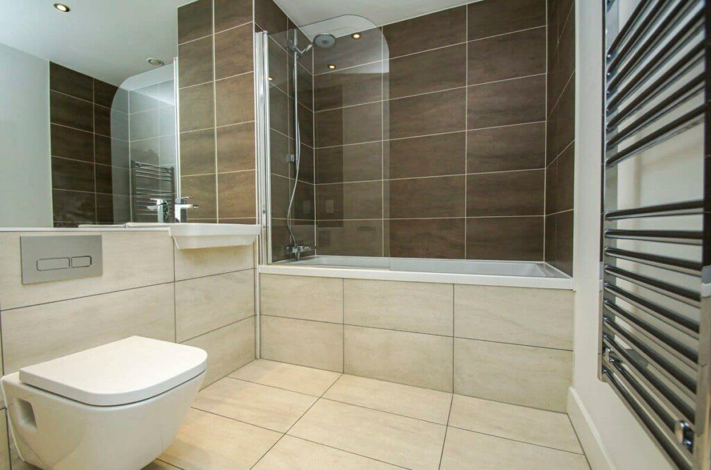 Hotel style finish with bath and shower overhead, WC, sink and heated towel rail.