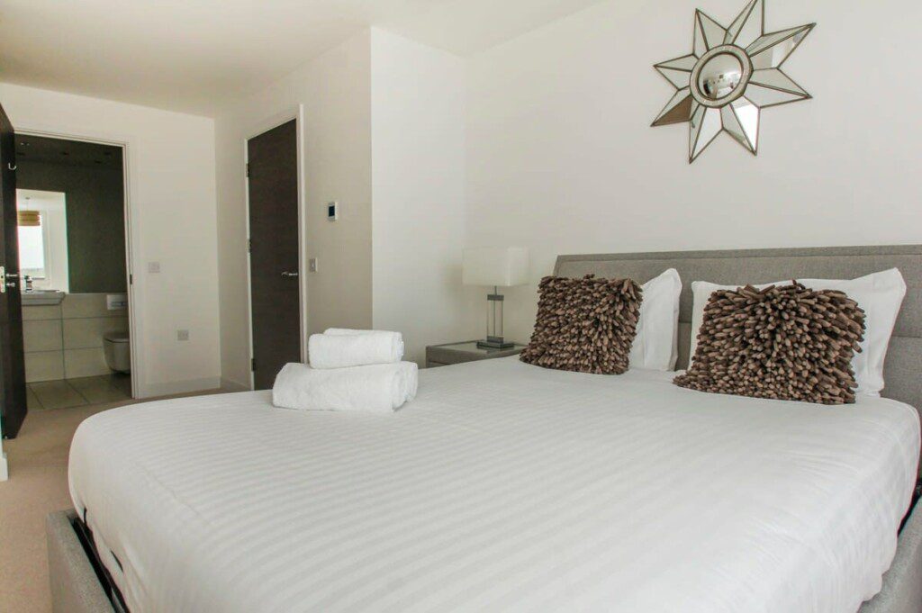 Stylishly simple with king size bed and grey side tables with lamps. There is a built in mirrored wardrobe to put away your belongings and an en-suite.