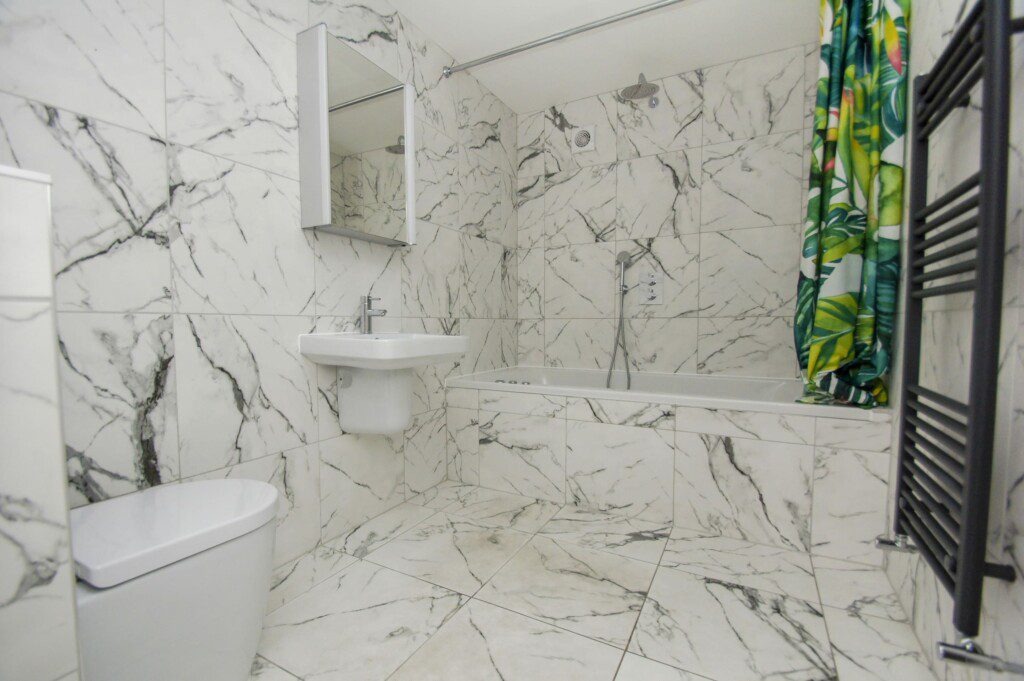 The marble effect bathroom has a large Jacuzzi bath with a rainfall shower as well as a hand-held shower, sink and a mirrored cabinet with storage above, heated towel rail and a toilet.
