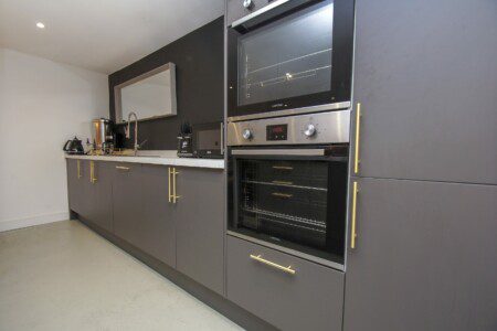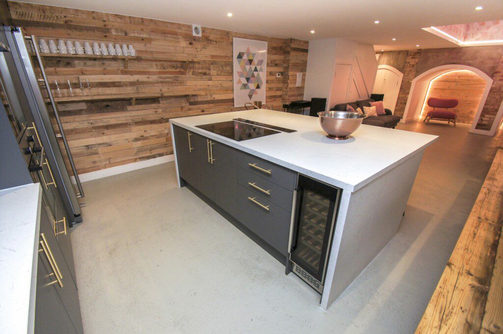 White stone worktops house charcoal grey units with integrated appliances such as dishwasher, washer/dryer, two fan ovens, five ring hob, American style fridge freezer as well as a wine cooler. The kitchen is fully stocked with all you need to prepare a meal – whether it’s a sit down dinner or breakfast in the morning. For the coffee lovers, there is a filter coffee machine as well as a hot water dispenser.
