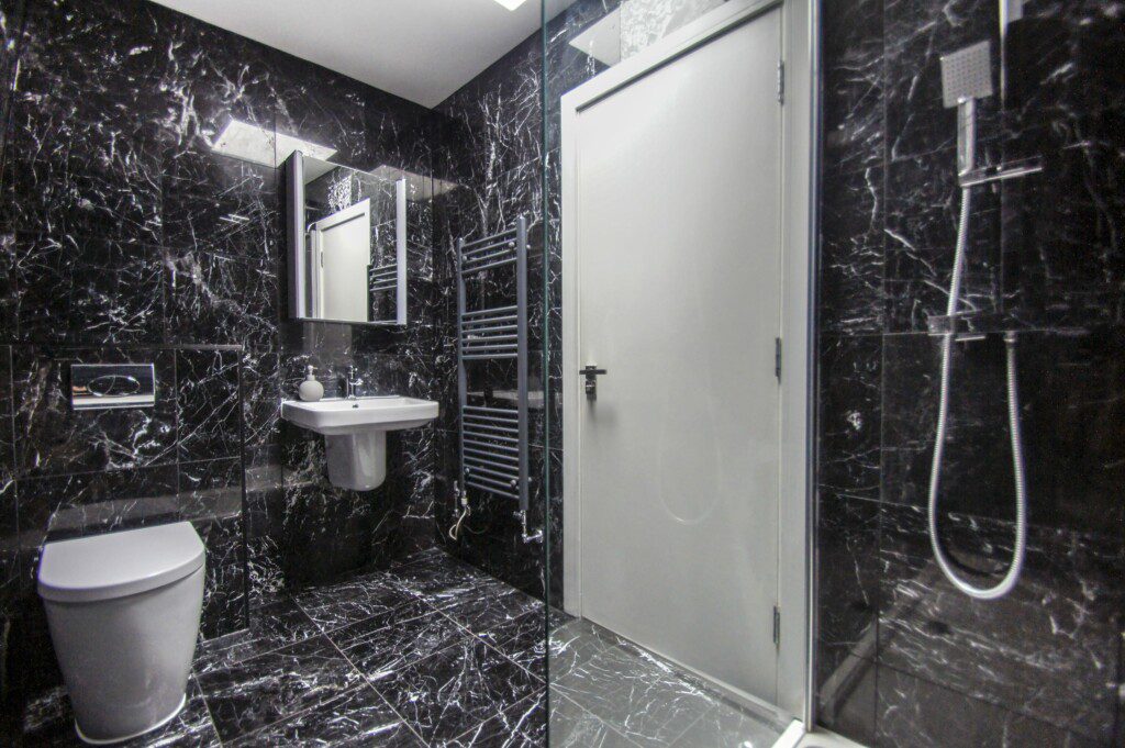 Black marble bathroom with a double walk in shower, sink and a mirrored cabinet with storage above, heated towel rail and a toilet.