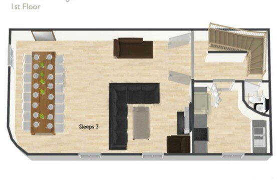 Flooded with natural light, the first-floor living and dining area is an inviting space to unwind with a luxurious leather corner sofa, real flame fire, large plasma TV, iPod dock, and WiFi. For extra guests there is a double sofa bed and a single chair bed.