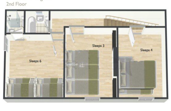 A spacious room with two large triple sleeper bunks (double beds with singles above), complete with ensuite bathroom for added convenience.