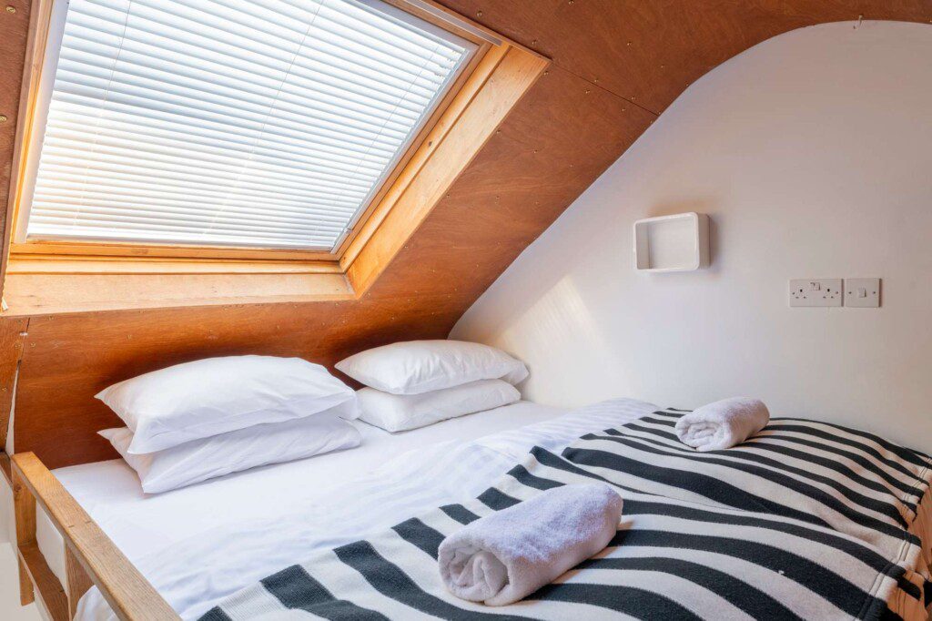 Comfortable two small single beds, which can be pushed together to form a double, with an additional two full size singles on a platform accessed by ladder, making a versatile family-friendly space.