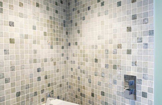 Full family bathroom with bath, overhead shower, wash basin, heated towel rail, and WC.
