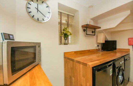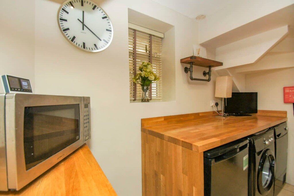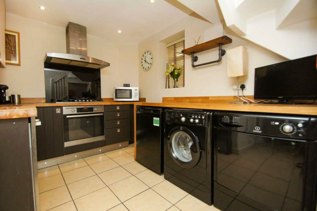 Black gloss integrated kitchen located on the lower ground floor. All of your amenities are to hand including washing machine; tumble dryer; microwave; dishwasher; fridge with freezer compartment; TV; bosh coffee pod machine.