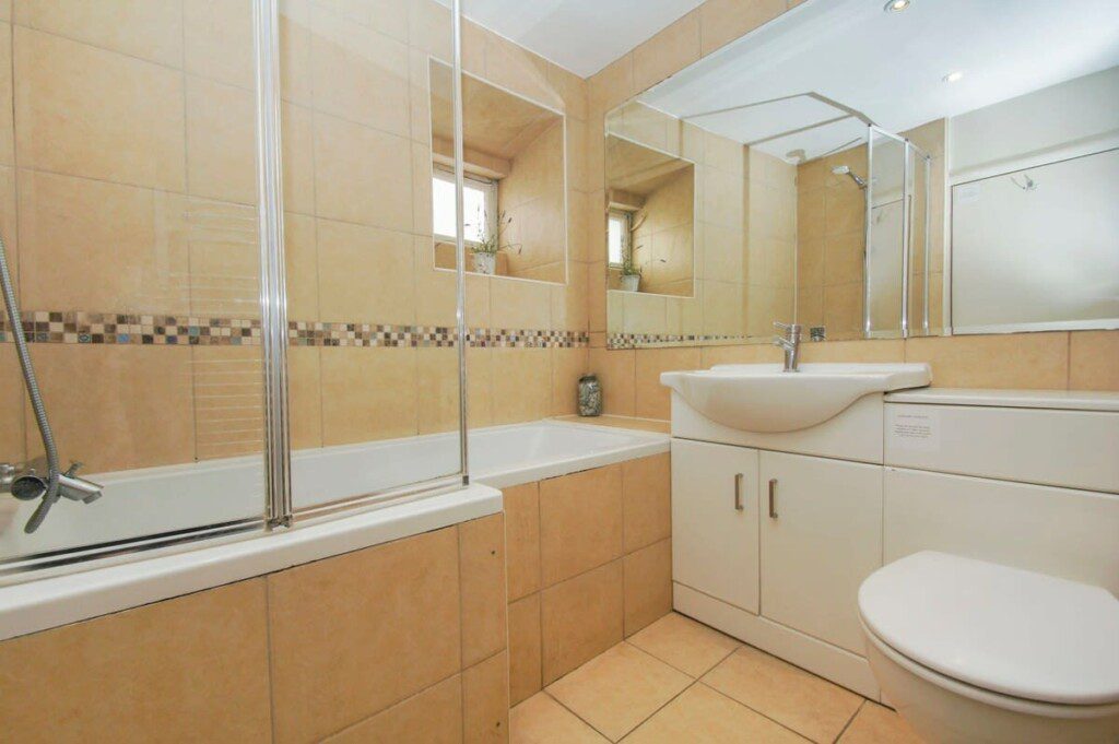 Located on the lower ground floor, this hotel style bathroom has a L shaped bath with wall mounted shower, built in sink and WC with storage, and a heated towel rail.