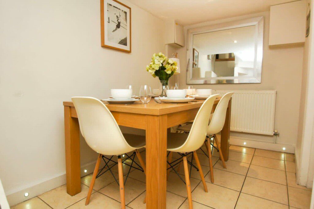 Ambient spot lighting sets the mood for the dining space, with a wooden table to seat six with four chairs and two stools.
