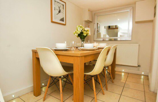 The living room greets you as soon as you enter the house. A great space to sit back and relax, with a two seater sofa, sofa bed for two extra guests, and an occasional chair, all with a good view of the wall mounted 48″ HDTV.