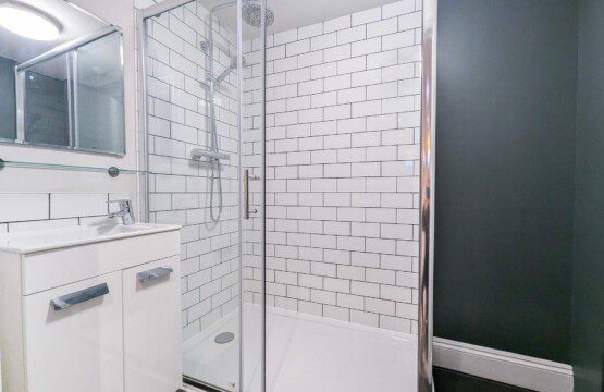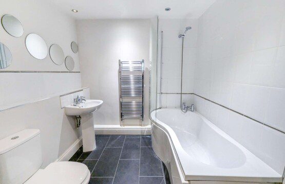 An ensuite bathroom on the ground floor with a bath, overhead shower, basin, and WC.